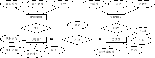 在校田径运动会中设置了各类比赛。每一比赛类别有类别编号、类别名称和主管等属性,每一比赛类别包含很多比赛项目,每一比赛项目有项目编号、项目名称、比赛时间和级别等属性。各个学院团队有团编号、团名称、领队等属性,每个学院团队有多名运动员组成,运动员有编号,姓名,年龄,性别等属性。每一名运动员可以参加多个比赛项目,每一比赛项目有多名运动员参加,运动员参加比赛有成绩属性。