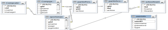 Compcate(比赛类别)、compgame(比赛管理)、schoolteam(学院团队)、sportsman(运动员)、partin(参加)