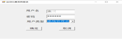 当操作者输入了用户名、密码和用户类型时,系统就打开sportsgame数据库中的userinfo用户信息表进行识别。若用户名、密码和用户类型正确,操作者就可以登录到运动比赛信息管理系统中,同时系统根据角色权限的类别授予权限范围。若选择“系统管理员”身份则可操作整个系统;若选择普通用户登录则只能对系统中的相应权限操作